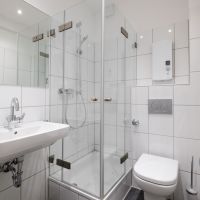 - Badzimmer aus Naturstein mit Dusche und verglaster Kristallglas-Duschkabine