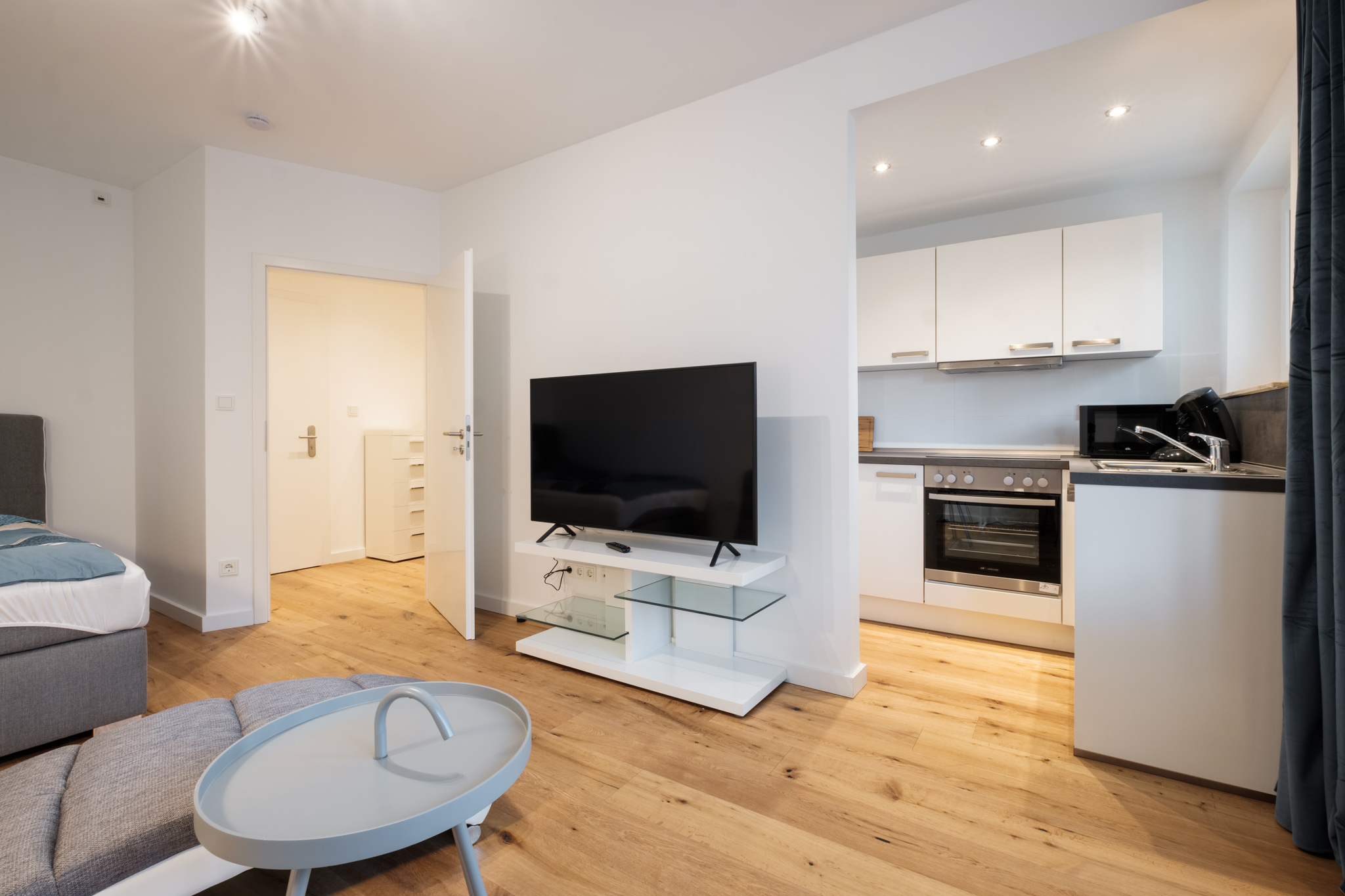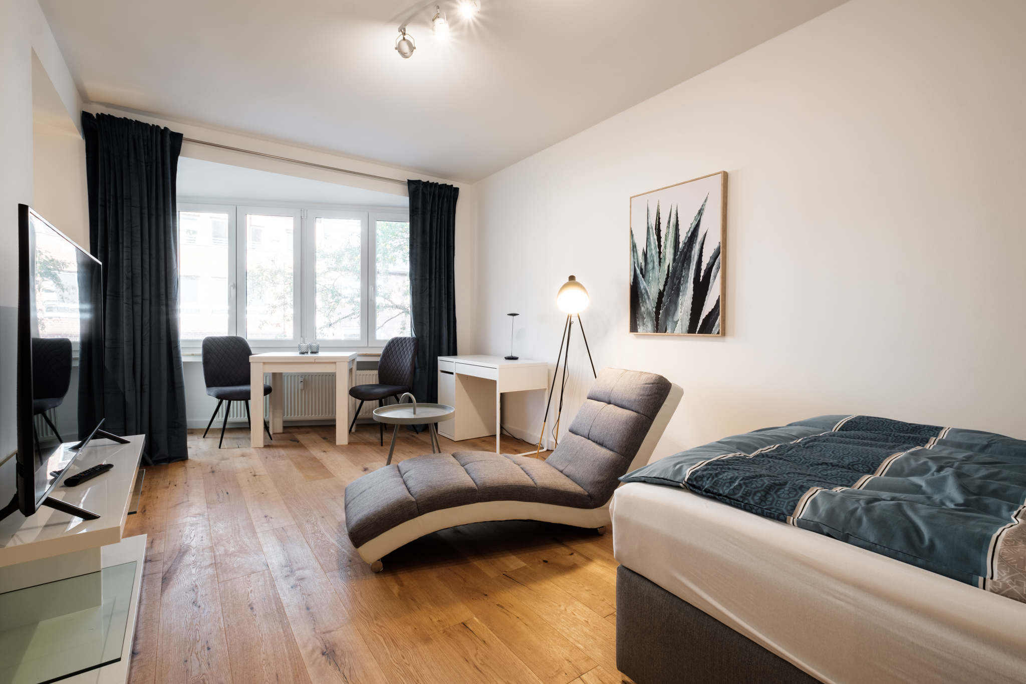 - Zimmer mit 160er Boxspringbett ,Schreibtisch, Esstisch und zwei Stühlen, Relaxliege, Beistelltisch, TV Board