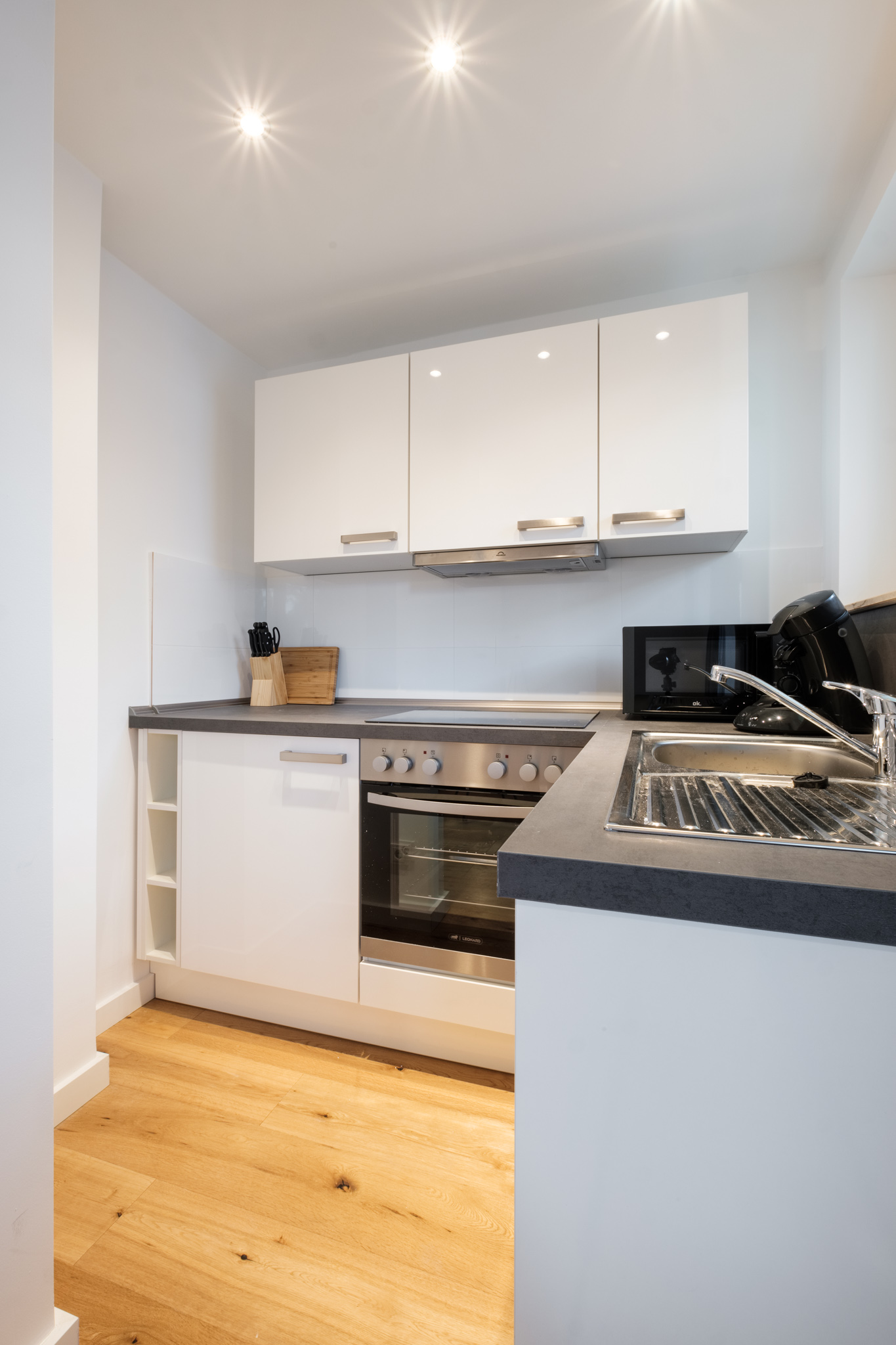 - Offene Hochglanz-Küche mit Ceranfeld, Spülmaschine, Mikrowelle, Backofen, Dunstabzug und hochwertigen Einrichtungs- und Haushaltsgegenständen
