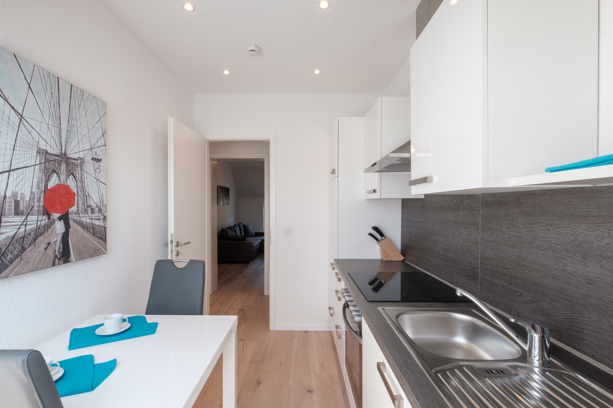 - Große Wohnküche in Hochglanz weiß mit Ceranfeld, Spülmaschine, Mikrowelle, Backofen, Dunstabzug und hochwertigen Einrichtungs- und Haushaltsgegenständen